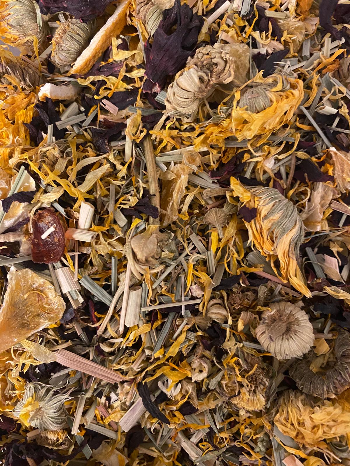 Harness the power of golden marigold petals with a refreshing fusion of lemongrass, orange peel, hibiscus, and rosehip. This vibrant blend supports natural detoxification, improves digestion, and promotes glowing skin from within.