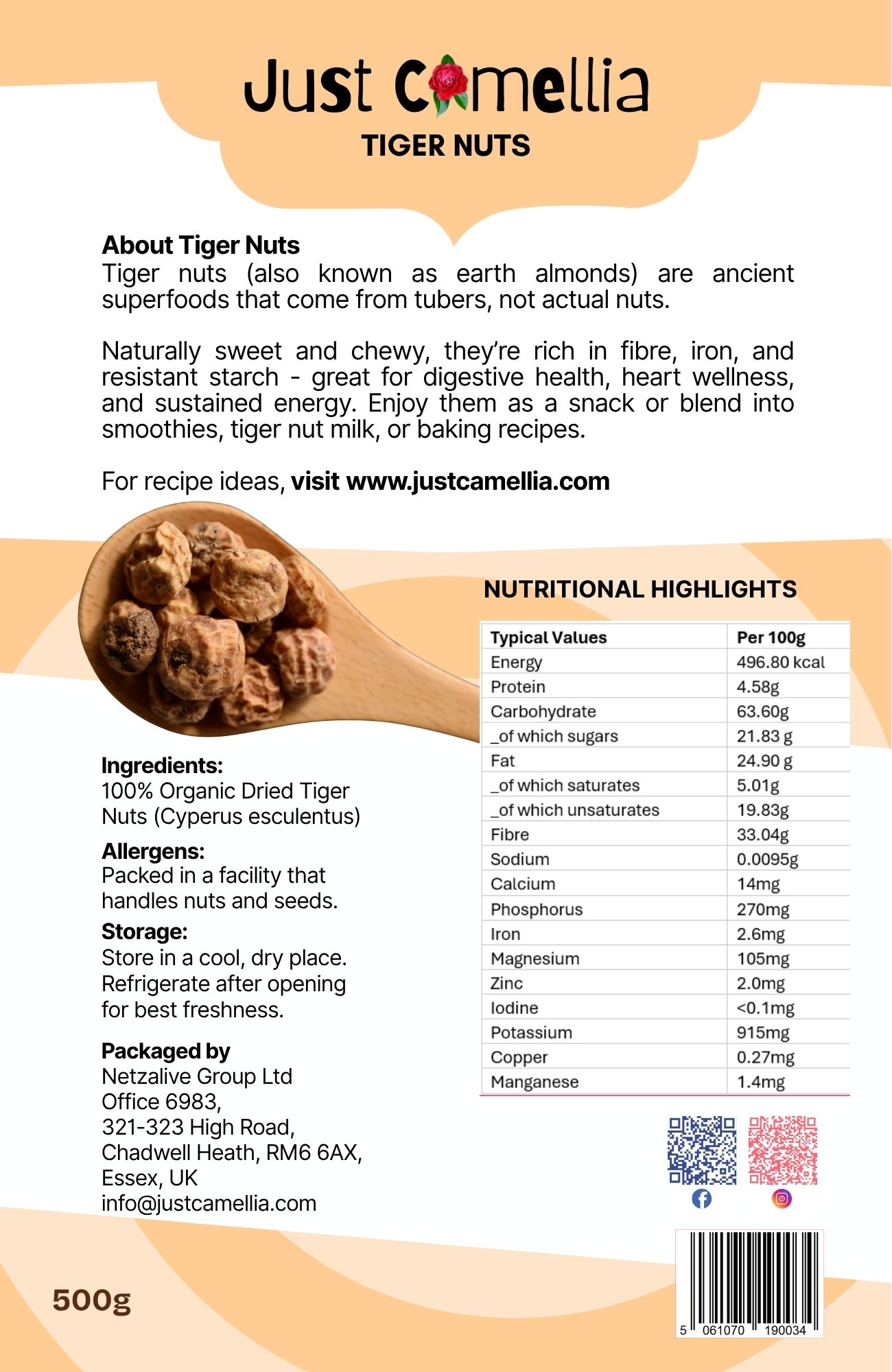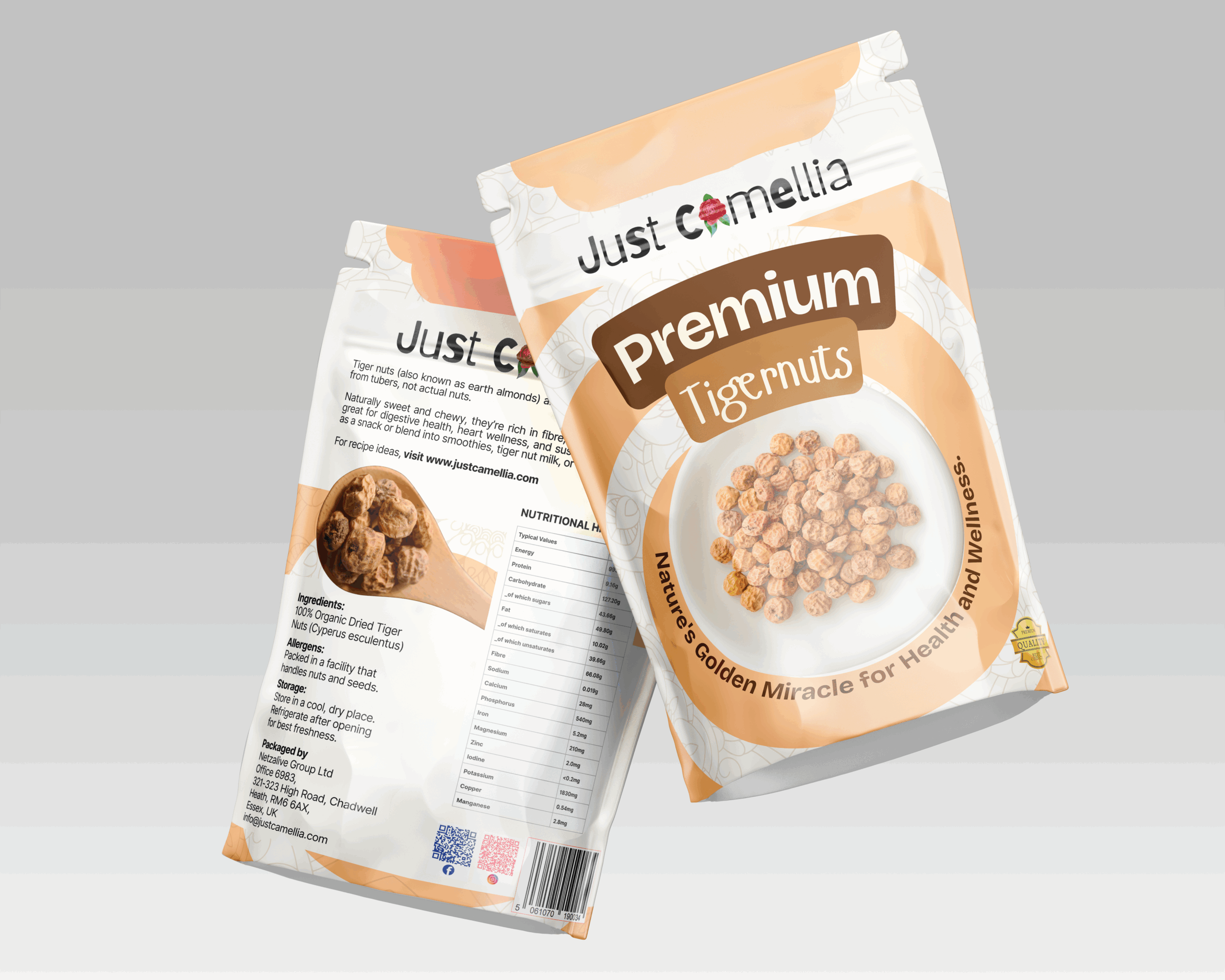 Fuel your body with the wholesome crunch of Just Camellia Premium Dried Tiger Nuts. Also known as earth almonds, tiger nuts are nutrient-dense tubers high in fibre, iron, and healthy fats—great for digestion and long-lasting energy. Naturally sweet, chewy, and satisfying, they’re ideal as a snack, or blended into smoothies, tiger nut milk, and healthy baking.